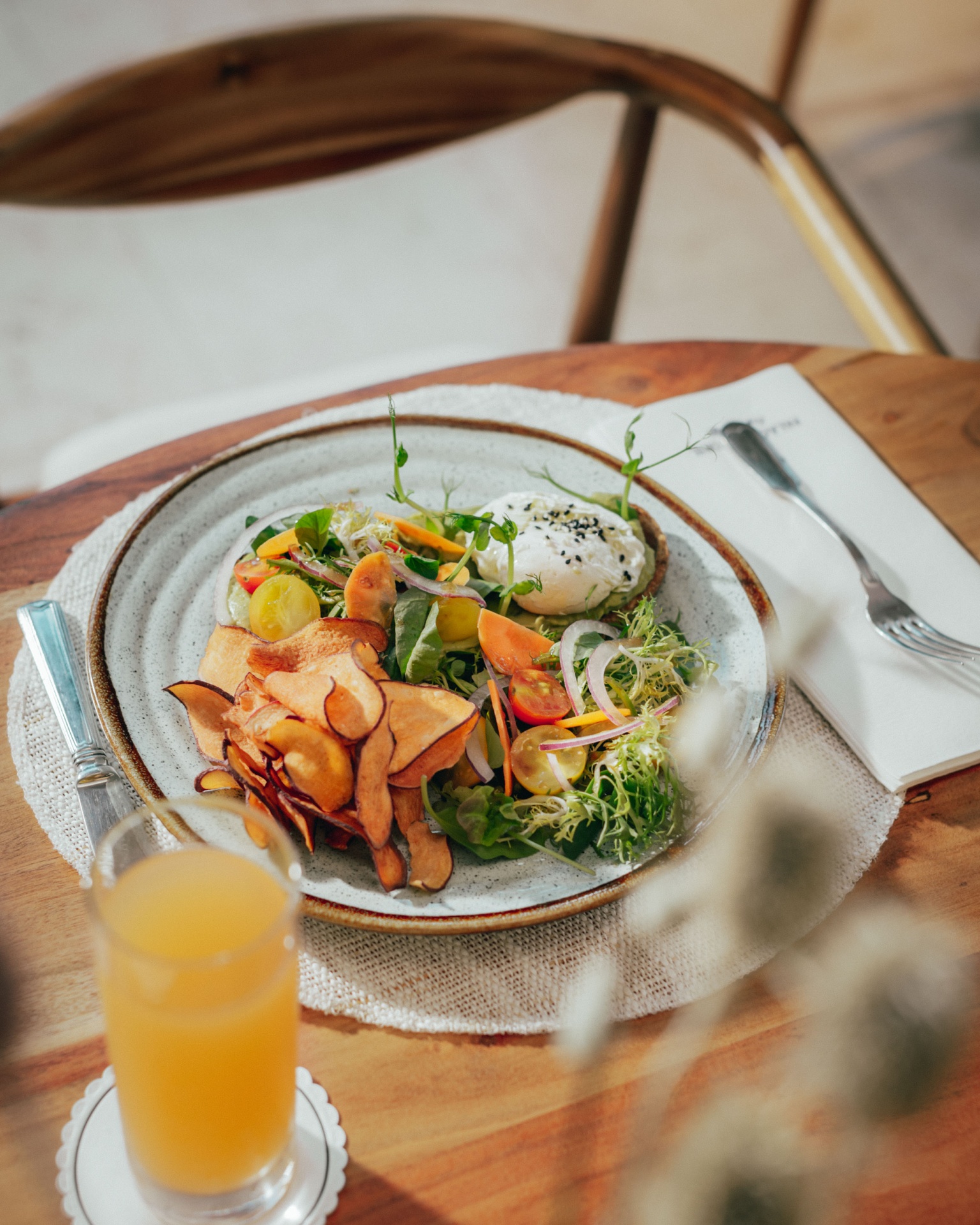 -Tosta de abacate e ovo com chips de batata doce e salada